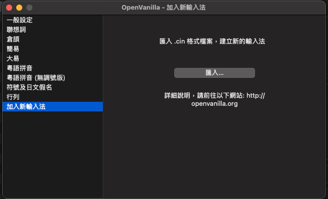 3. 安裝 Openvanilla 軟體之後,輸入法切換到 Openvanilla,並選擇 Openvanilla 偏好設定,選擇 加入新輸入法 並匯入下載好的 cin 嘸蝦米字庫檔。